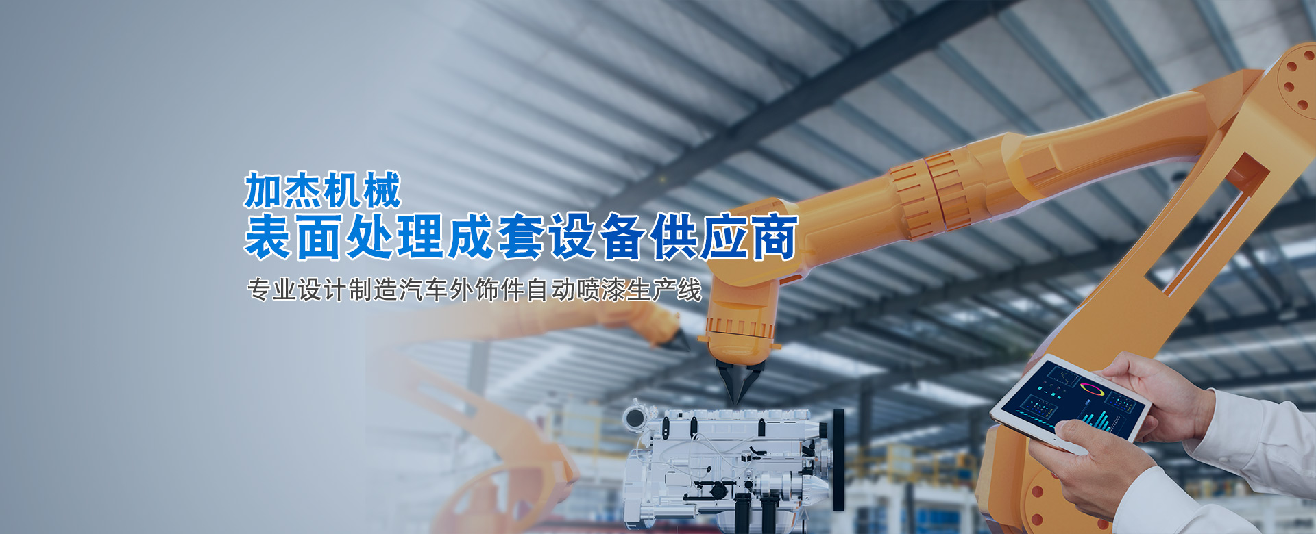 加杰智能裝備(廣東)有限公司是廣州市加杰機械設備有限公司的全資子公司,加杰成立于2007年。是一家專業于表面處理行業智能化涂裝設備的研發、設計、制造、安裝與售后為一體的綜合型企業,專業于塑膠、金屬部件的噴漆、電泳、噴粉等成套自動涂裝線交鑰匙工程。 公司在廣州花都和廣清產業園均有自建研發及生產基地,占地面積六萬余㎡,旗下有加杰智能、川捷智能、漢潔科技、泰國加杰四家子公司。公司同華南理工、廣工、北理工等知名大學院校展開深度合作,并積極展開自主創新和...